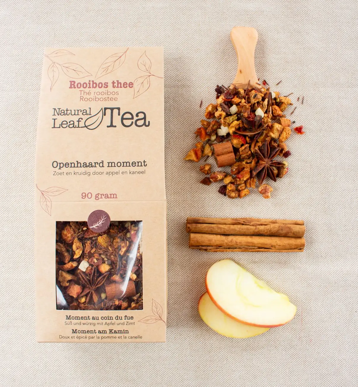 Openhaard moment is een aromatische rooibos thee met een zoet en kruidig karakter. Appel en kaneel zorgen voor een vertrouwde, warme smaak, terwijl steranijs en een vleugje ananas het geheel net wat extra diepte en een lichte zoete twist geven. Deze thee past daarom perfect bij koude dagen en rustige avonden.