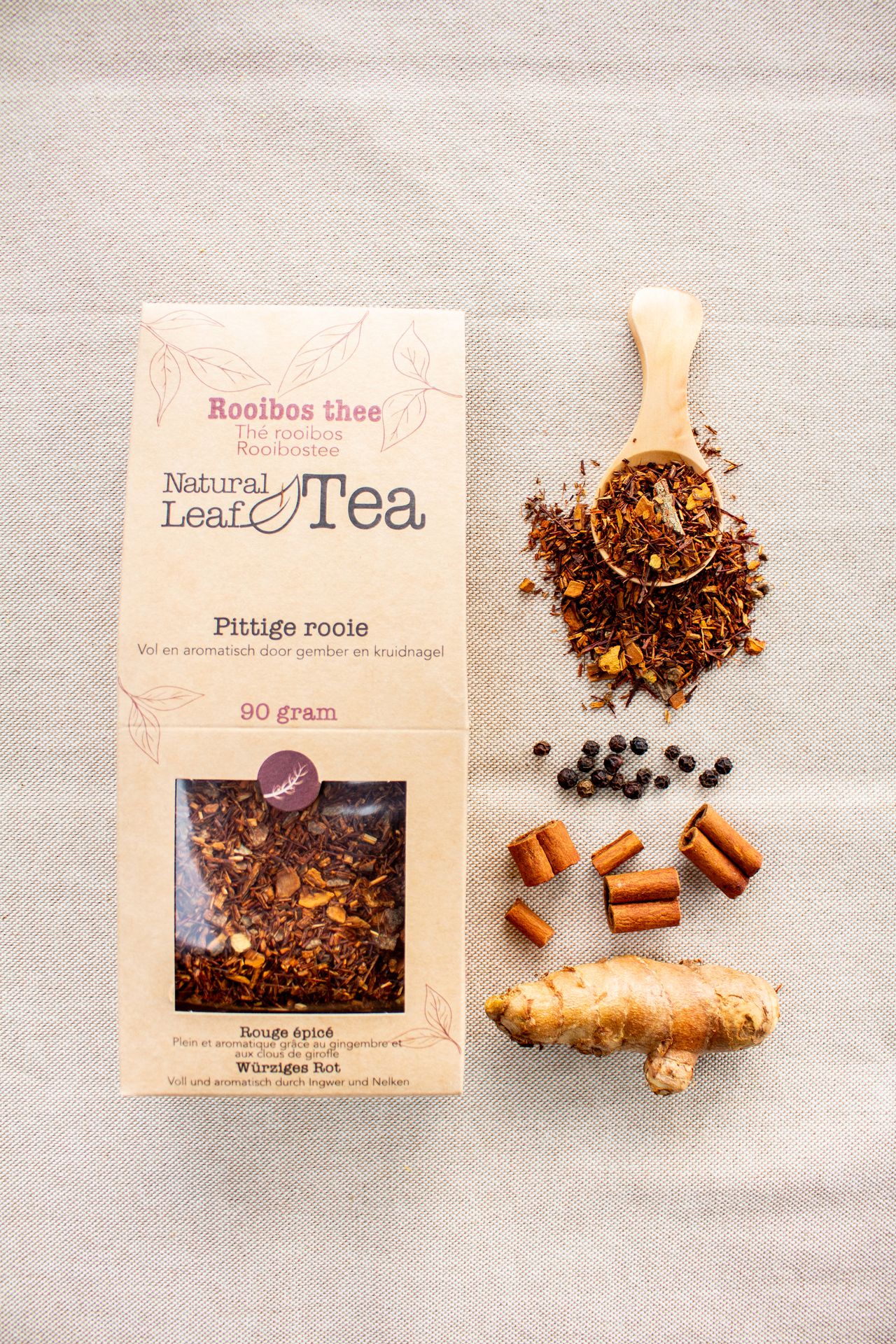 Laat je verwarmen door Pittige Rooie, een volle en aromatische rooibos thee met kruidige tonen van gember, kaneel en kruidnagel. De zachte natuurlijke zoetheid van rooibos en het licht pittige karakter zorgen samen voor een rijke en verwarmende smaakbeleving. Perfect voor ontspannen momenten en extra genieten op koude dagen. Heerlijk als pure thee, maar ook ideaal als basis voor een traditionele chai latte met warme melk.