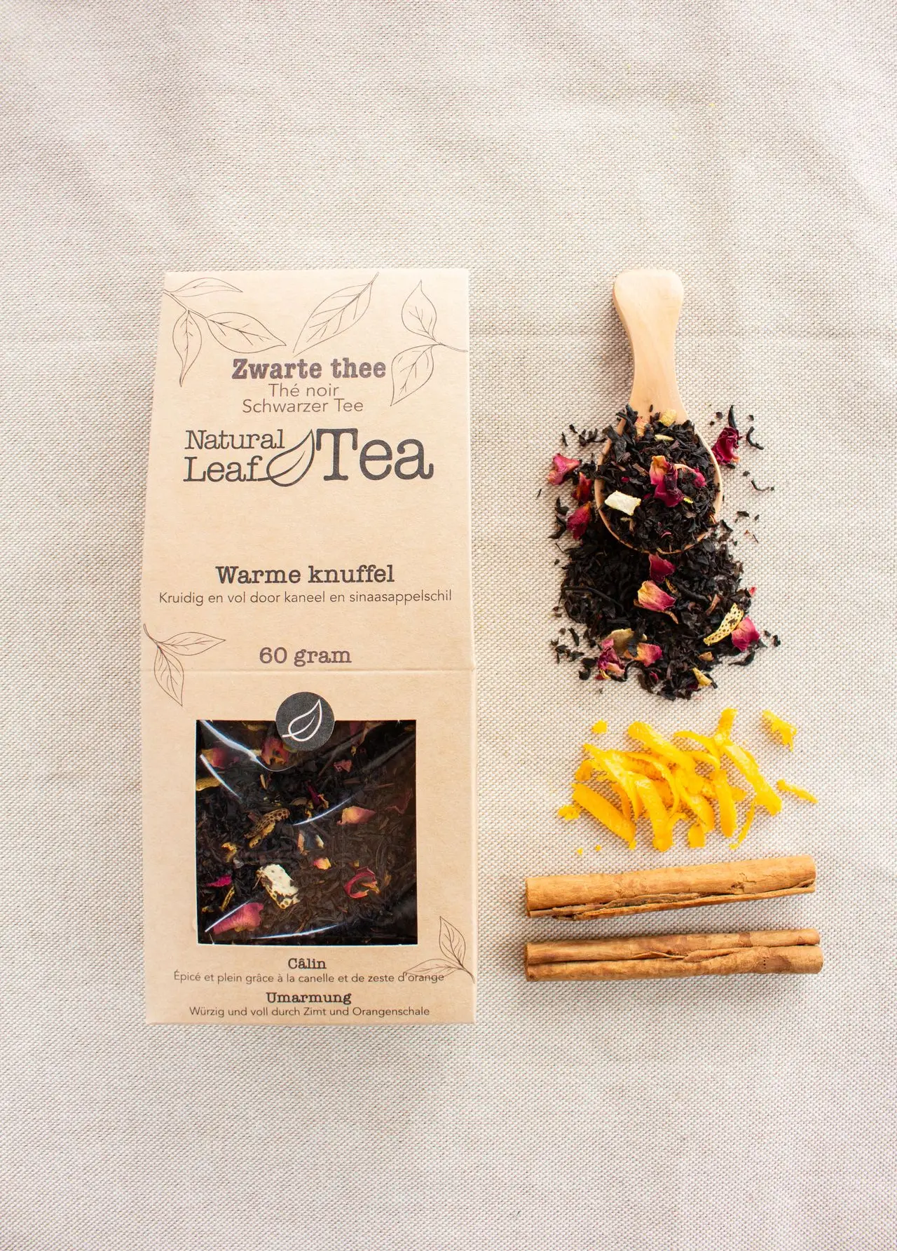Warme knuffel is een volle zwarte thee met een kruidig karakter. De combinatie van kaneel en sinaasappelschil zorgt voor een rijke, warme smaak met een licht frisse twist. Stevig, maar toegankelijk, precies wat je zoekt op een koudere dag.
