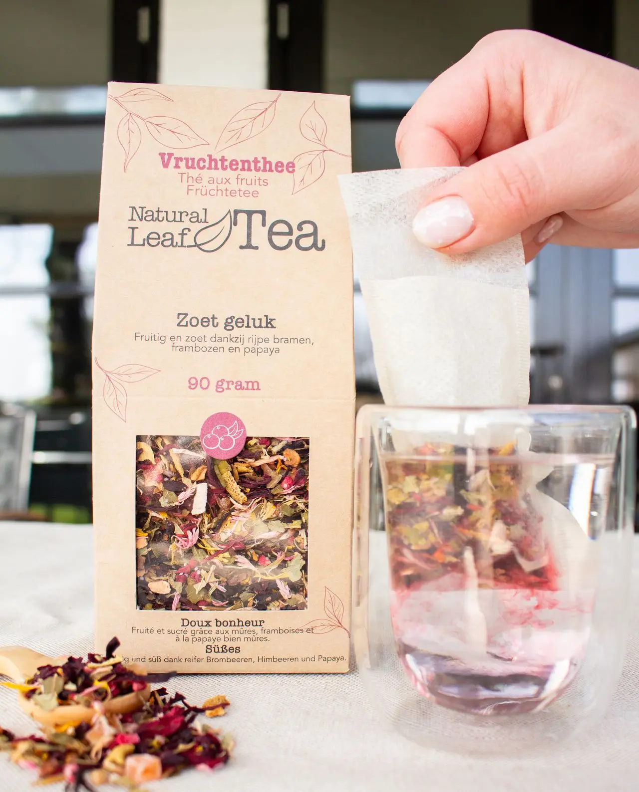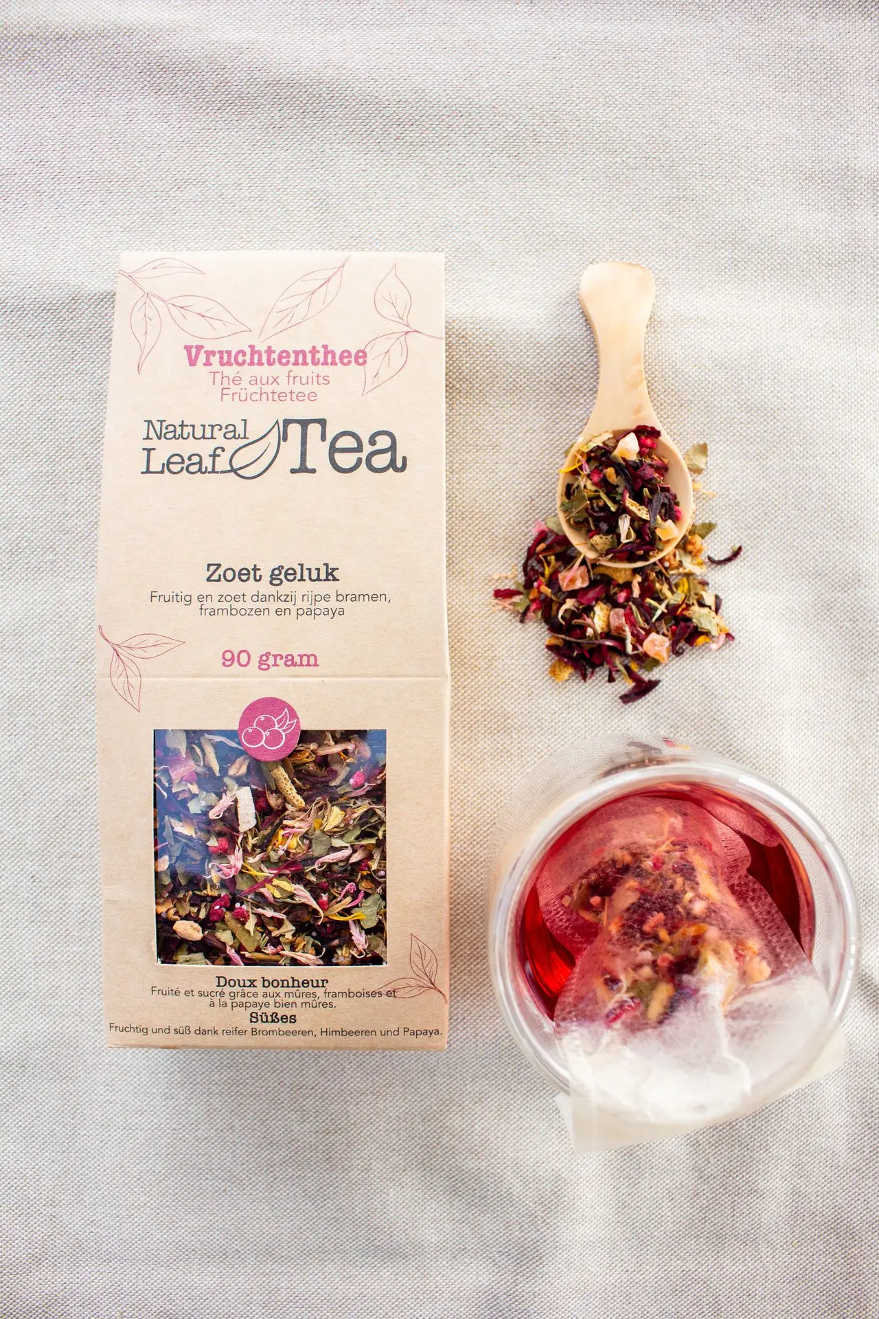 Zoet geluk van Natural Leaf Tea is een toegankelijke, vruchtenthee met zoete tonen van bramen, frambozen en papaja, in balans gebracht door frisse hibiscus en appel.