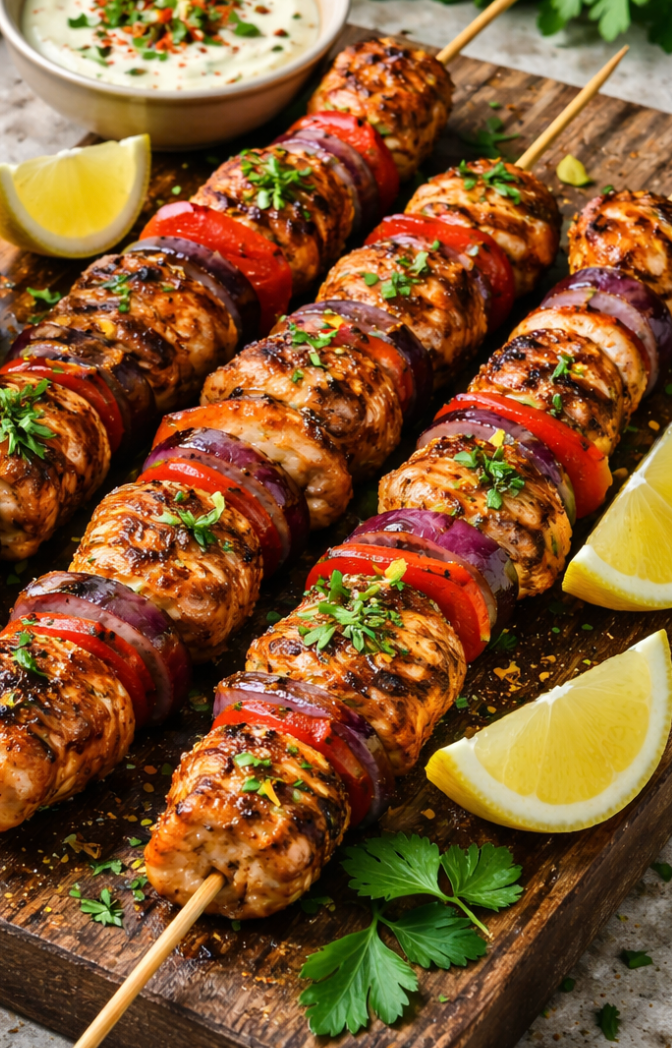 Grill de spiesjes op middelhoog vuur in ongeveer 10–12 minuten. Draai ze regelmatig zodat ze mooi gelijkmatig garen.